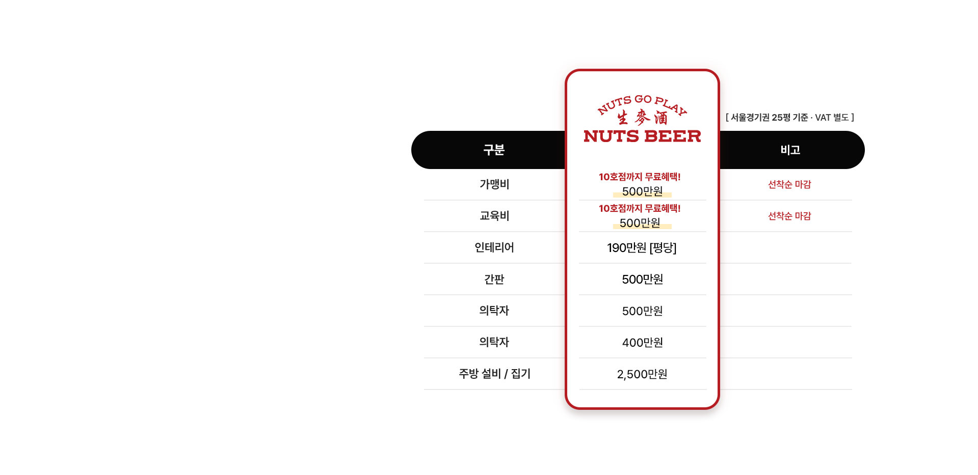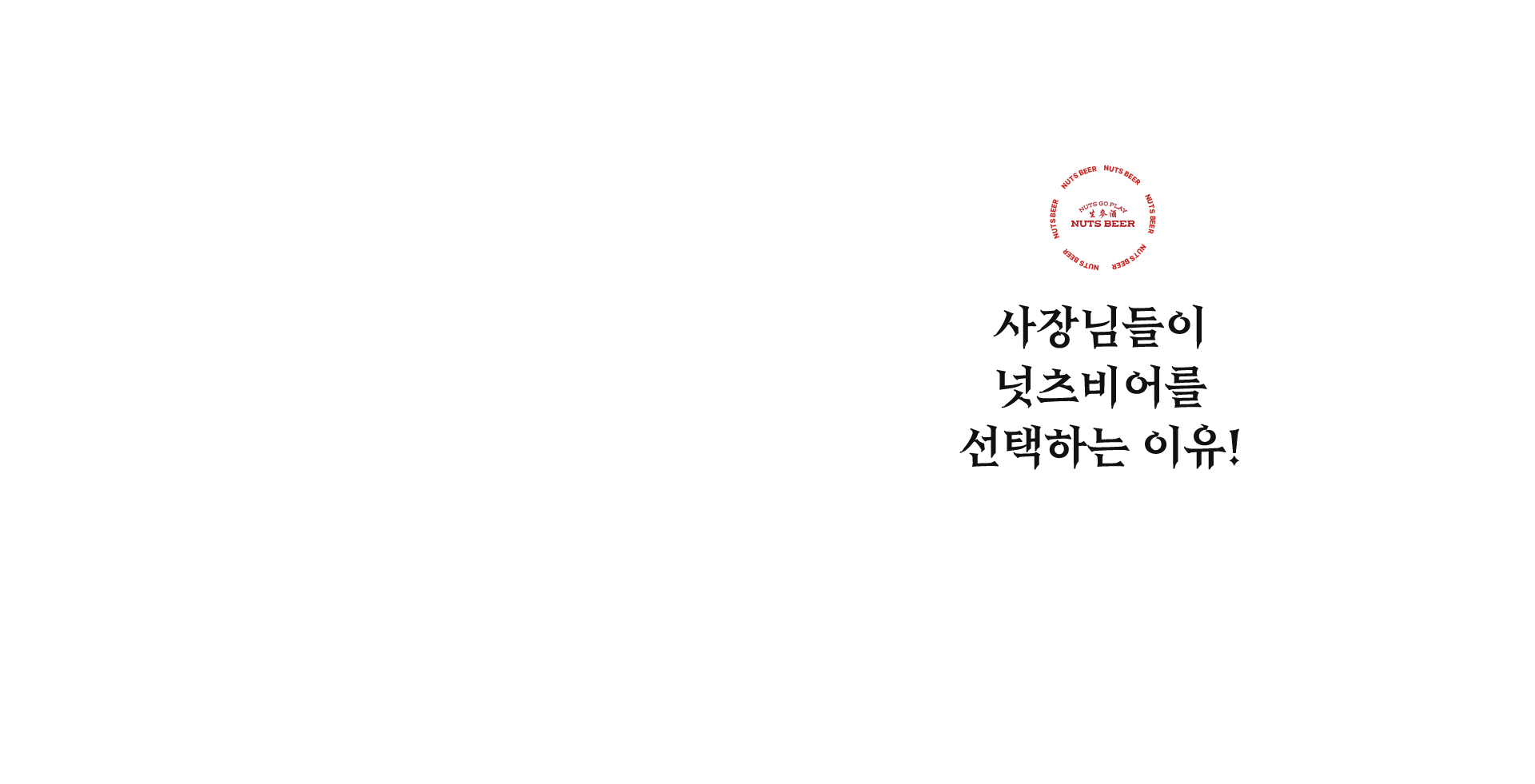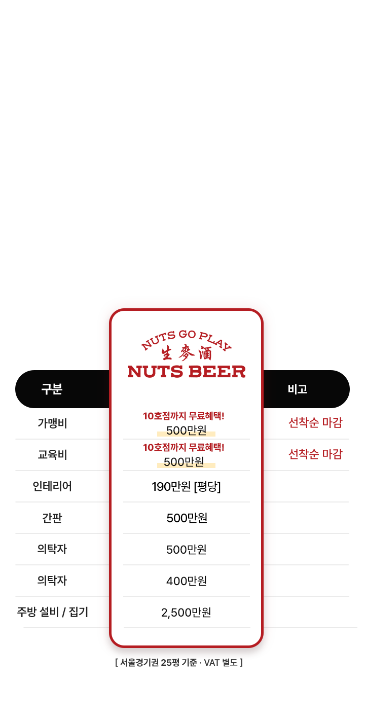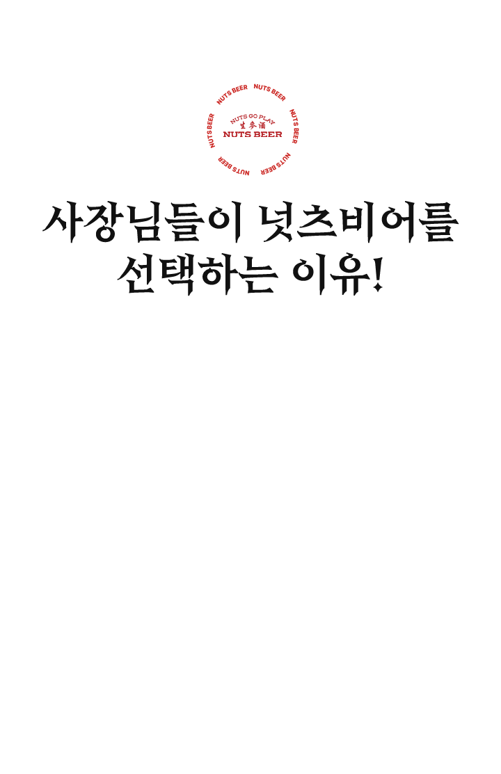 넛츠비어는 정도경영을 추구합니다. 식자재비를 무리하게 인상하거나 매장 리모델링을 강요하는 경우는 없다고 단언합니다. '점주님과 함께 웃을 수 있는 브랜드'가 되겠습니다.
